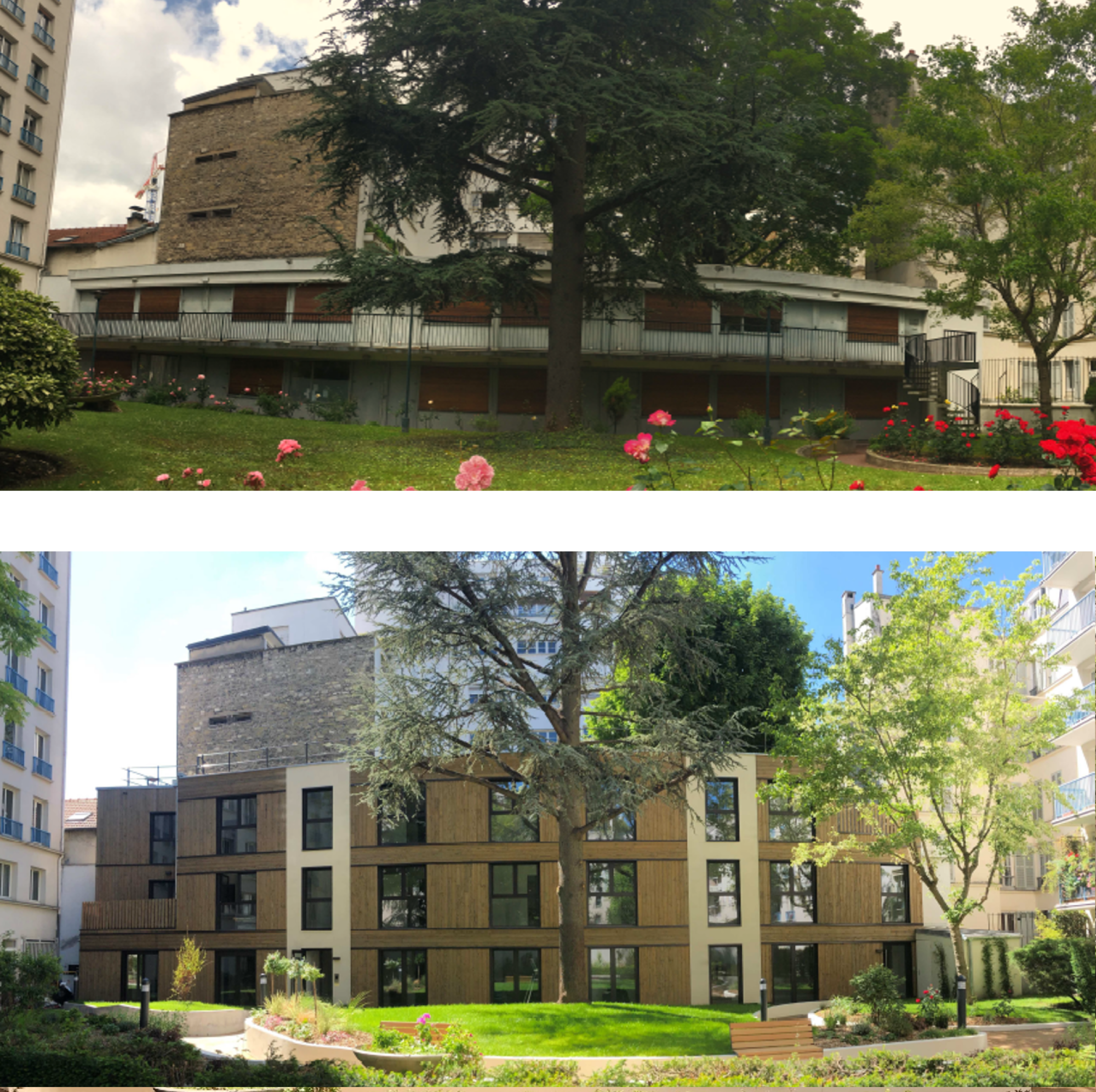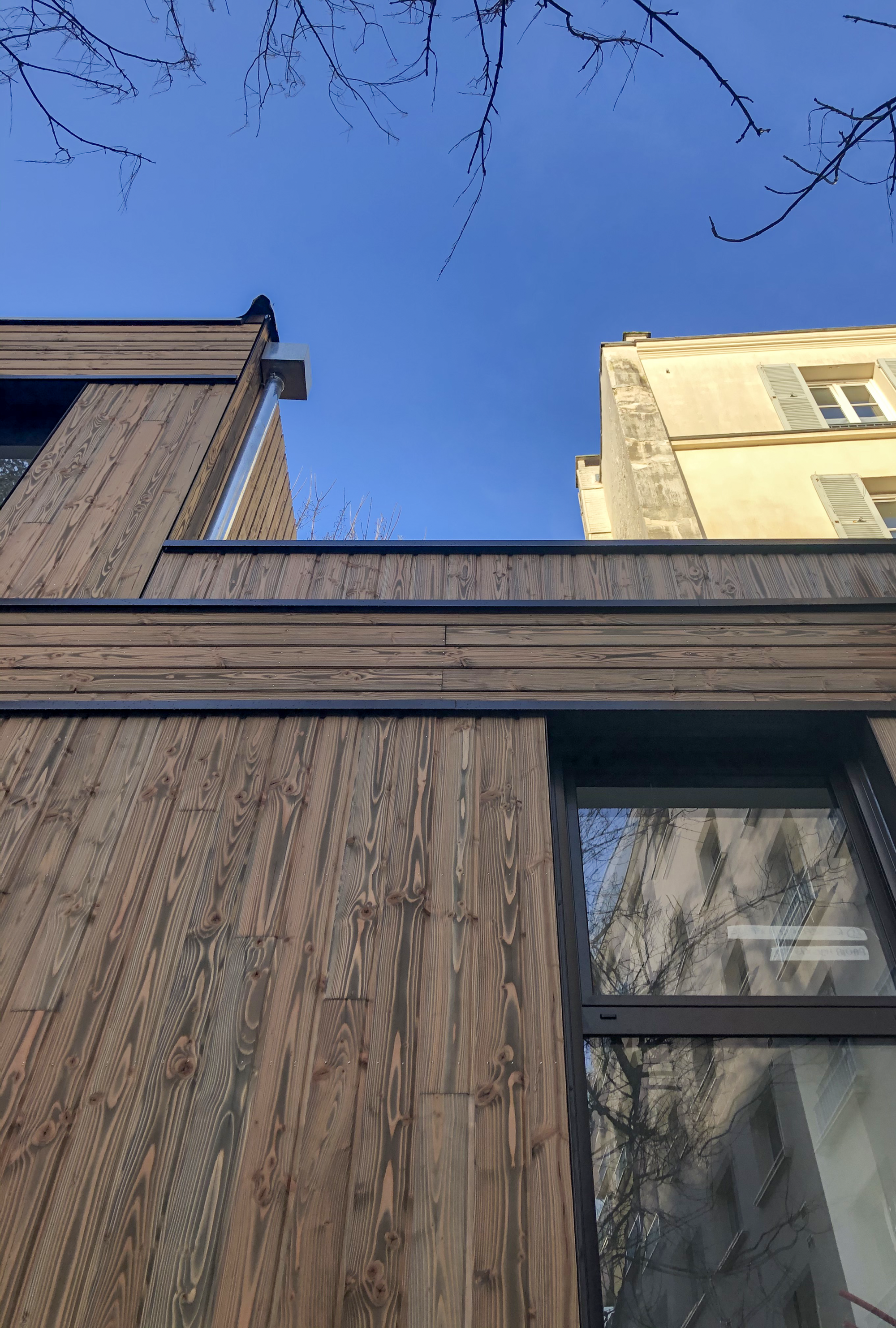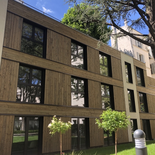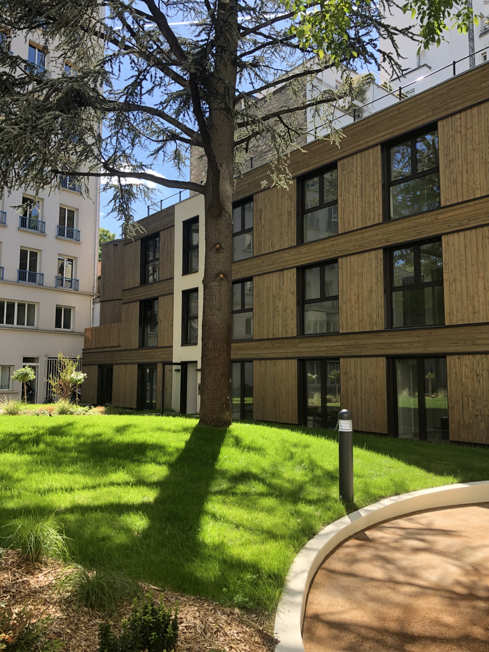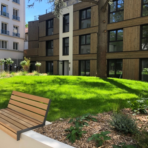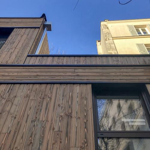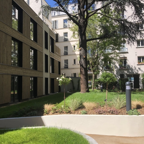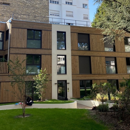 Au centre d’une parcelle traversante du 14ᵉ arrondissement, le projet prend place en cœur d’îlot, à l’écart de l’alignement sur rue. Le bâtiment existant est entièrement démoli pour laisser place à une construction neuve, développée sur trois niveaux, tout en conservant la même emprise au sol. Cette reconstruction transforme dix-huit studios en dix logements aux typologies variées, offrant des espaces plus généreux et adaptés aux modes de vie contemporains. L’architecture s’appuie sur une structure mixte, associant ossature bois et dalles béton, avec certains voiles en béton pour assurer stabilité et pérennité. Une écriture sobre et maîtrisée, au service d’un habitat renouvelé, lumineux et durable.