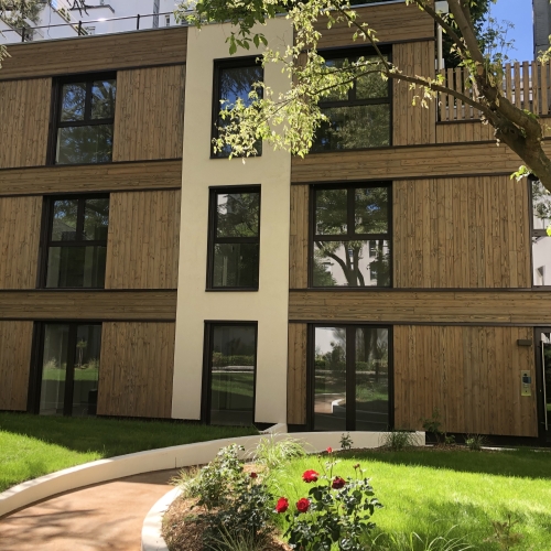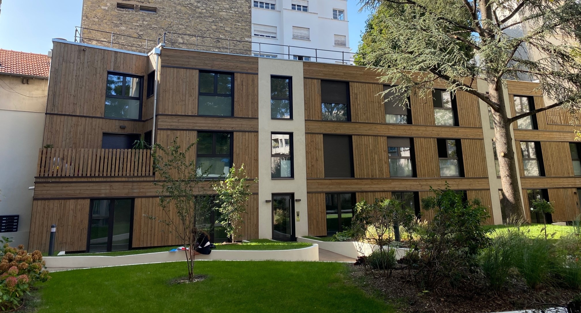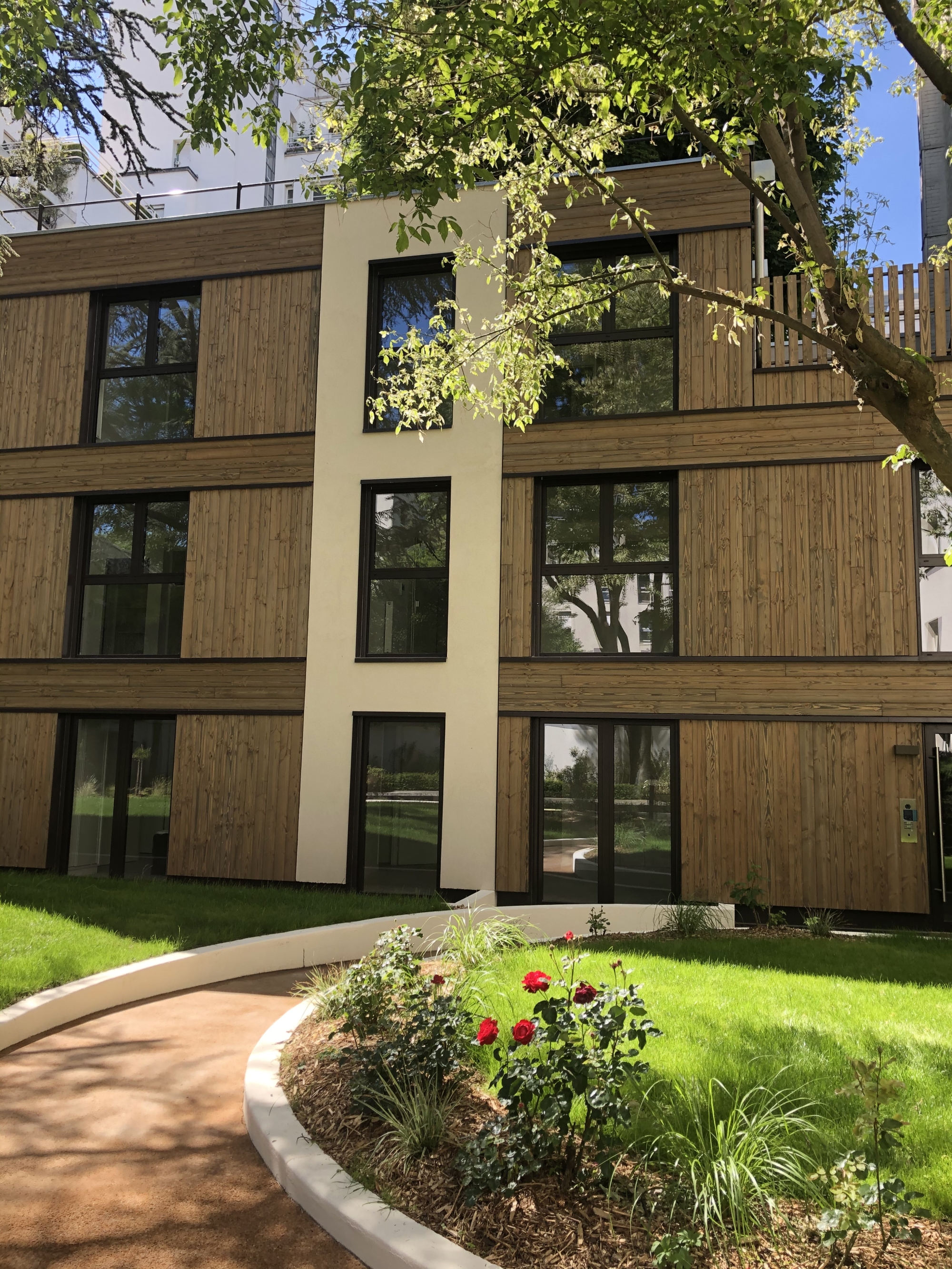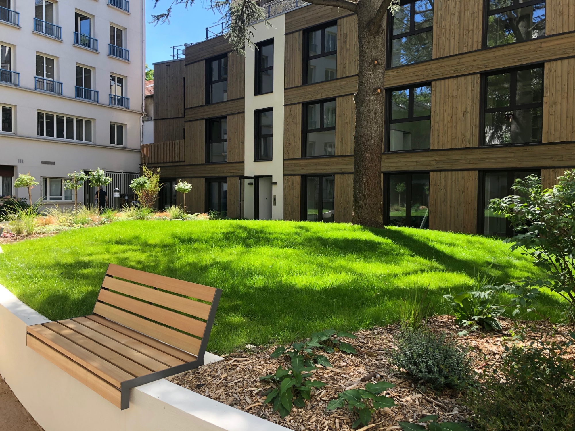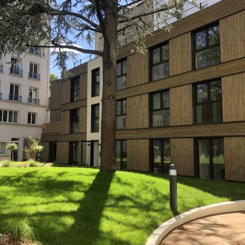 Au centre d’une parcelle traversante du 14ᵉ arrondissement, le projet prend place en cœur d’îlot, à l’écart de l’alignement sur rue. Le bâtiment existant est entièrement démoli pour laisser place à une construction neuve, développée sur trois niveaux, tout en conservant la même emprise au sol. Cette reconstruction transforme dix-huit studios en dix logements aux typologies variées, offrant des espaces plus généreux et adaptés aux modes de vie contemporains. L’architecture s’appuie sur une structure mixte, associant ossature bois et dalles béton, avec certains voiles en béton pour assurer stabilité et pérennité. Une écriture sobre et maîtrisée, au service d’un habitat renouvelé, lumineux et durable.