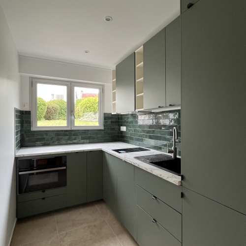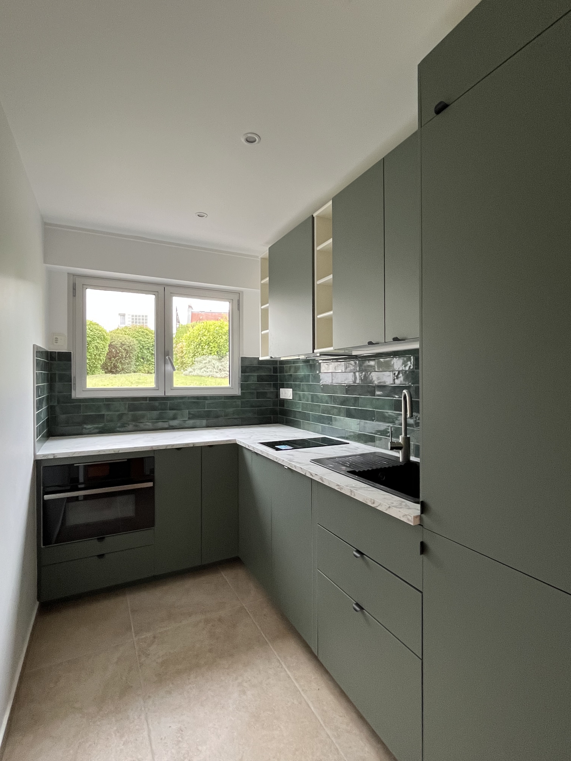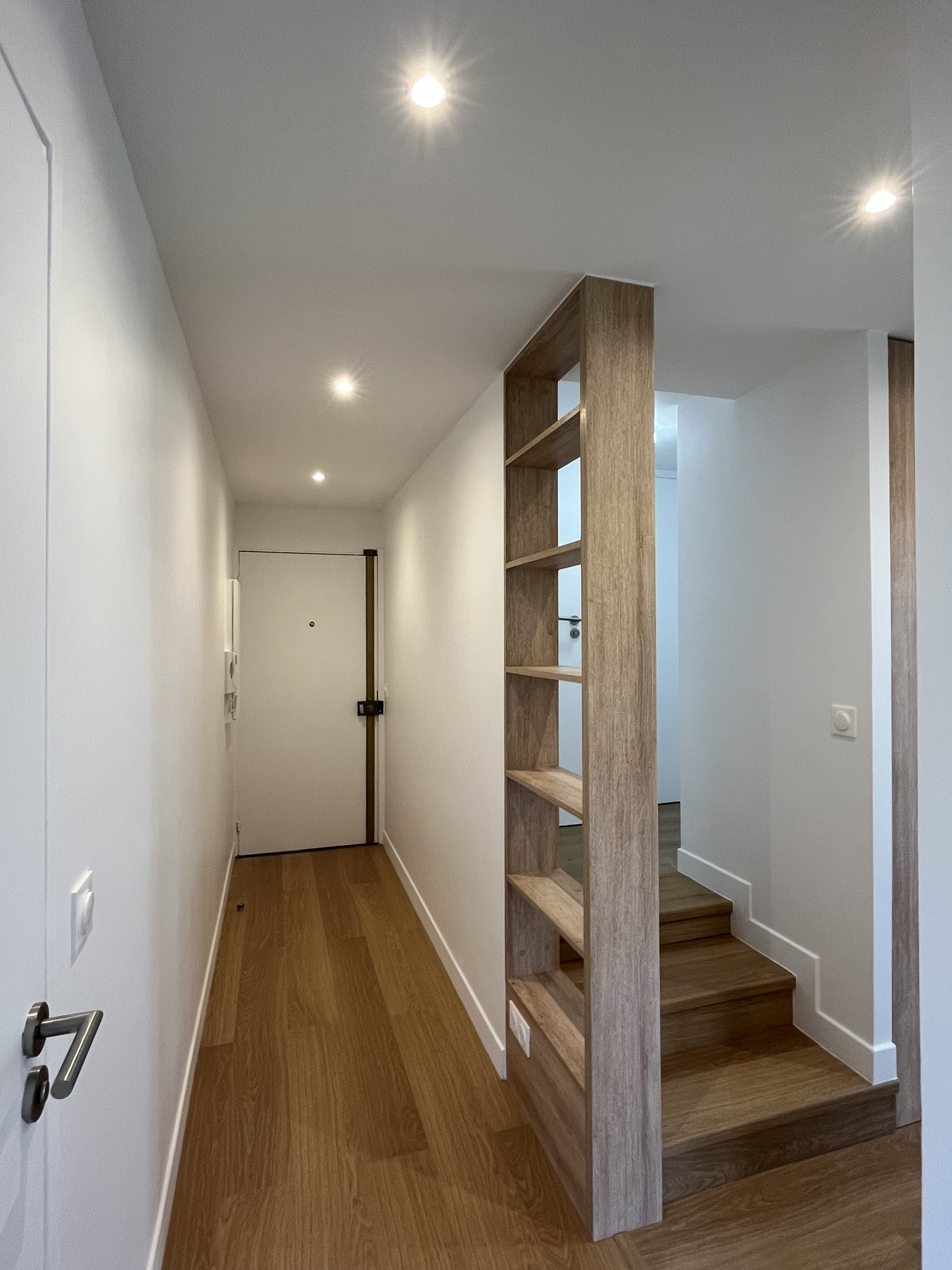 Nous avons réalisé la rénovation complète de cet appartement de deux chambres en rez-de-chaussée, en repensant les volumes et la circulation afin d’en révéler tout le potentiel.Les espaces ont été optimisés pour apporter davantage de fluidité et de lumière, tandis que des matériaux sobres et des aménagements sur mesure structurent l’ensemble avec élégance et fonctionnalité.Ce projet illustre notre volonté de transformer l’existant en un lieu de vie harmonieux, contemporain et durable.